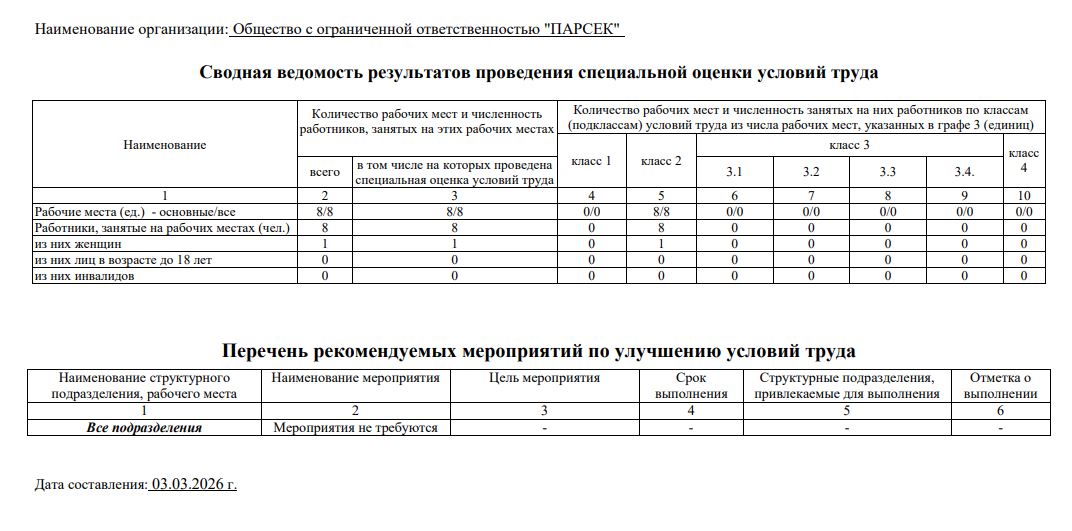 В соответствии с требованиями нормативных документов в области охраны труда в ООО "ПАРСЕК" проведена специальная оценка условий труда вновь организованных рабочих местах.